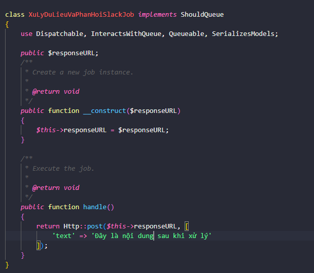 - Để mô phỏng quá trình xử lý dữ liệu, mình sẽ tạo 1 job trong Laravel để hàng chờ xử lý, tránh kéo dài thời gian phản hồi.