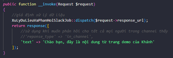- Controller này của mình hiện tại sẽ chỉ cần 1 action duy nhất, ở đây mình sẽ sử dụng action là __invoke() với biến $request để nhận dữ liệu từ Slack