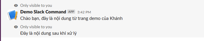 - Sau khi thành công thì Slack sẽ hiển thị như ảnh, trong bài này mình chỉ sử dụng text để phản hồi, Slack còn cung cấp các định dạng khác để cho phản hồi đẹp hơn, các bạn có thể tham khảo thêm để sử dụng tùy theo mục đích.