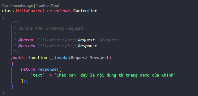 - Đầu tiên chúng ta sẽ tạo 1 controller và route cho Laravel nhận dữ liệu. Ở bài trước mình đã đặt url là api/hello-khanh, nên giờ mình sẽ tạo HelloController và route tương ứng của nó ở api route