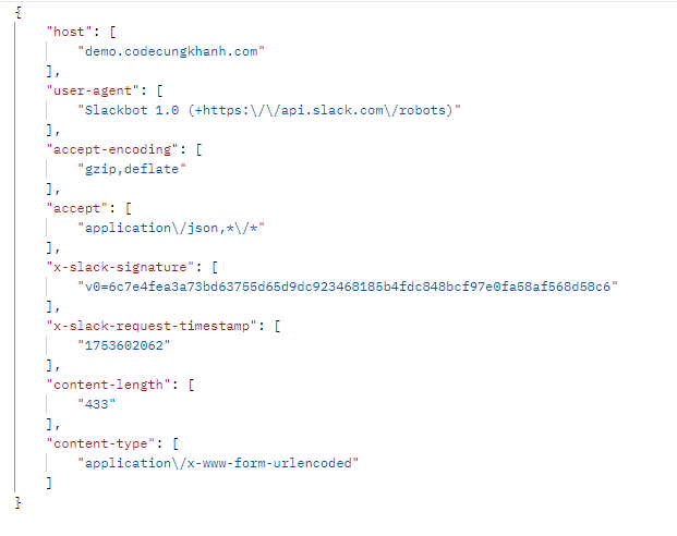 - Dữ liệu từ Slack gửi đến sẽ bao gồm chữ ký ở header và nội dung lệnh ở body