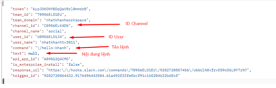 - Phần request body sẽ bao gồm thông tin lệnh, nội dung kèm theo, thông tin kênh và người gửi tin, trong trường hợp này mình đã gõ lệnh /hello-khanh từ channel Social và không kèm nội dung lệnh