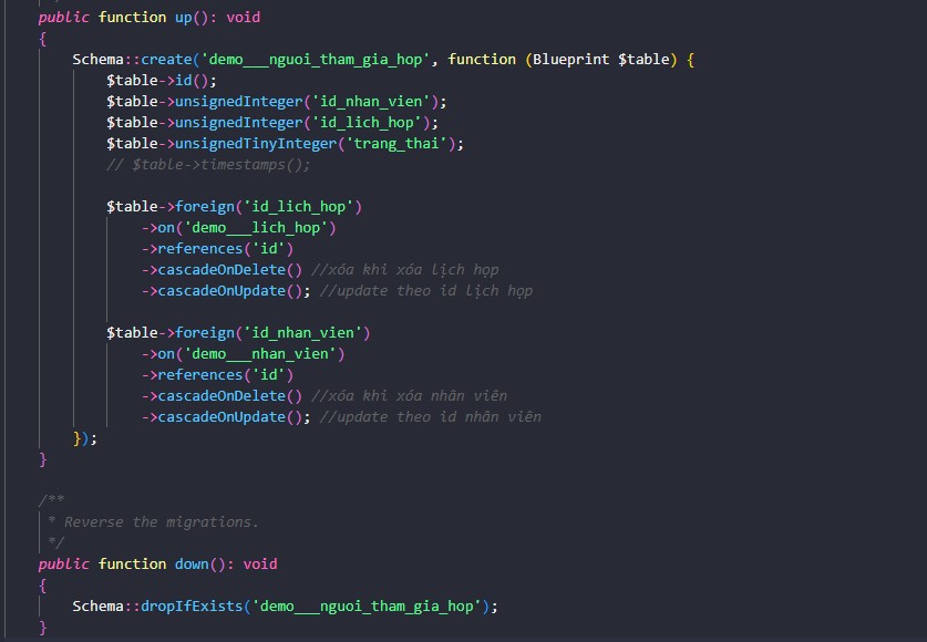 - Trong các file migration này mình cũng quy định khóa ngoại (foreign key) để khi cập nhật id hoặc xóa id của các bảng chính thì bảng con cũng sẽ tự thay đổi theo.